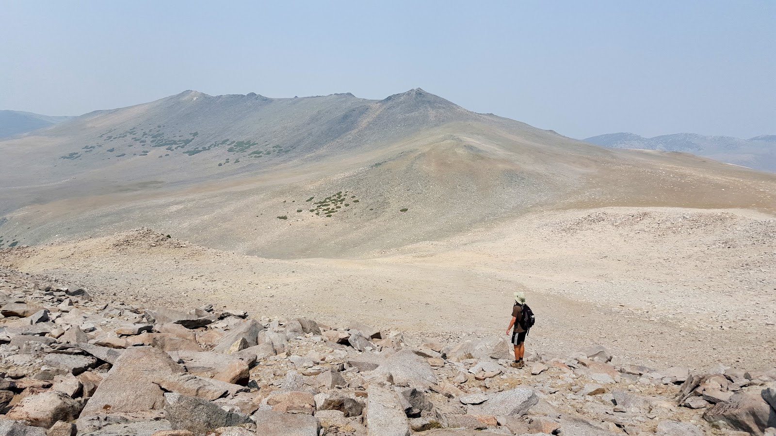 The climb to the Cloudripper ridge led to a false summit, then a class 3 climb up and across a narrow ledge. As with Vagabond, Dima pulled ahead of me, and when I reached the false summit, he was already on top as a group of other climbers were coming down. After the other group cleared the summit, I cautiously made my way over on good rock. The final climb was not overly difficult, but the exposure on both sides was dramatic and unnerving. The summit boasted a newer looking wooden sign and the register was in a shiny metal tube. The views did not disappoint, despite the smoke that still choked the area. The Palisade crest loomed to the south hugged by a few remaining glaciers. Chocolate Peak and the Chocolate Lakes were small and distant. There were giant mountains and beautiful lakes in all directions. We both had some photo malfunctions. I had damaged my camera on the warm up hike the day before and was relying on my phone. My camera app crashed while on the summit and would not load, requiring a reboot. I found out later I lost several pictures. Dima's camera ran out of battery power and he did not get all the pictures he wanted. After taking in the panorama, we started back. We had to reverse the boulder slogs down Cloudripper, back up the Vagabond ridge, saving maybe 100' of gain, back down Vagabond and the other 500' section. It was nice to get back on the trail. We made good time coming down from Green Lake and followed the pipeline shortcut back to the car. The pipeline trail required us to walk on the pipeline more than expected, so it became kind of a balancing act, but saved time and gain on the way back.