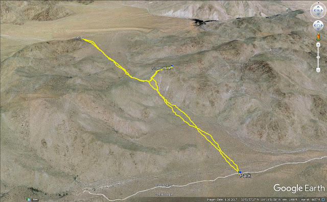 Prom 2674 (an odd name vs. Peak 2674, maybe prominence 2674?) is a small peak in the Tierra Blanca mountains. This was a short side trip on a hike whose main purpose was to cache water for an attempt on the Sawtooth Mountains High Point and Red Top. This peak would have been about 2.6 miles round trip if I had gone directly to it. I parked just off North Indian Canyon Road with a clear path to the pass over the Tierra Blanca Mountains. I had drawn up a route on Caltopo in case I had the time and desire to make the side trip. After hiking over the pass, I continued to Canebrake Wash and cached 128 oz. of water. At the top of the pass on the way back, I stopped to check the time and take a closer look at the ridge up to 2674. I had time so I headed up the short ridge to Prom 2674, only 0.3 miles from the pass. The summit had a pair of class 2 summit boulders. I looked around for a benchmark and/or register without luck. Honestly, I wasn't expecting to find anything at this obscure X-mark on the USGS topo. The views were pretty good, and it was high enough to see Sawtooth HP over Red Top. Not bad for a bonus. I should note that I got hit with cholla in the gully south of the pass, twice on the way up and twice on the way down. It is seriously choked with cholla. These hits were not from being tired and careless. I was alert and careful but still got nailed.