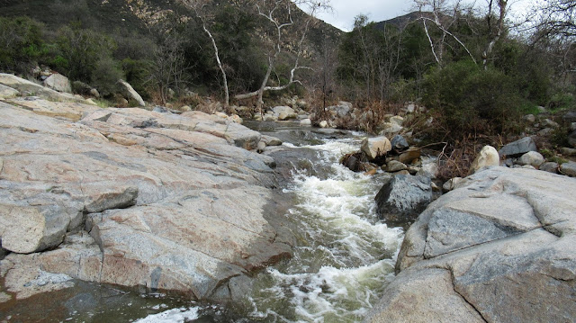 Wildhorse Canyon runs generally north/south, but there are some curves east and west. At the first big eastern bend, the side canyon continues north up a steep gully. After some initial tall grass, it led to a 200' boulder pile. This was some fun boulder scrambling and one of tallest piles I've seen around the Santa Anas (technically Riverside County here). The veneer had worn off some of the boulders exposing clean granite. At the top of the pile, a gully continued toward peak 2588 but was covered in a carpet of poison oak. I started down, making one more stream crossing below the main fall. Once I was out, I crossed Los Alamos creek and took the road back to the car. There were some fresh monster boulders strewn across the road. It could be a couple more years before Los Alamos road is opened again.