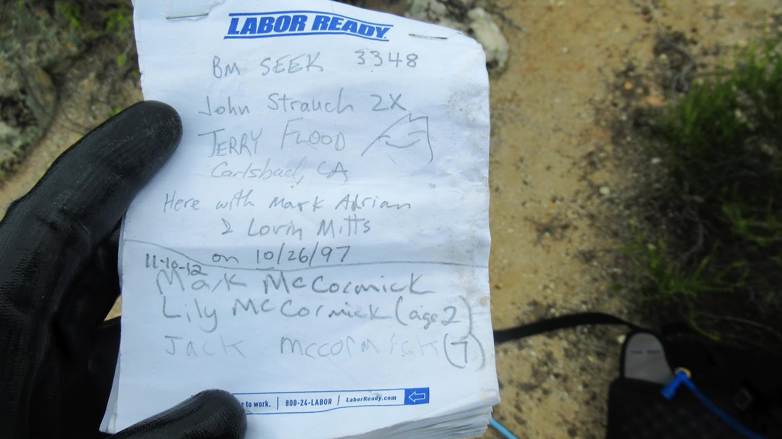 Seek Benchmark appeared to be only a quarter mile off trail. It started through deep grass that thinned out almost immediately. I was surprised to find footprints in the sand and some good animal trails heading sort of in the right direction. On the first low ridge, I followed a firebreak too far and had to come back and cross another field of deep grass. Foxtails were a minor annoyance as I waded through the grass. It soon became a GPS exercise and I am not sure I would have found Seek on the next low ridge without it. Reference mark number 1 was almost on top of the triangulation mark, a metal pole, and a register in yellow cans. The register was placed in 1997 but only three pages had been filled. I took a picture of all the pages. Another seldom visited point. Eric Newcomb was the last one to visit in April. Following a short break, I worked my way back to the trail. With little elevation change and no major obstacles, it was enjoyable, and probably the easiest hike I've done all year.