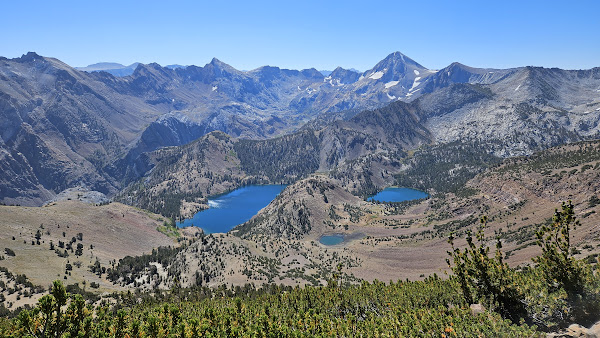 After 5 hours of driving, I finally set out in the open desert toward Bernard Peak, heading for the major gully. Little Berdoo was not visible. Small animals had dug burrows in the sand, tiny land mines that collapsed a few inches when I stepped on them. Annoying. Once in the canyon proper, I picked my way around brush and dry falls. A couple of falls required some class 2. There was a lot dried grass and weeds. I picked up a lot of foxtails, forcing me to stop half way up to get them out of my socks and boots. Route finding made progress slow. I exited the canyon just below Bernard, taking the final steep slope toward the highest of twin summits, Peak 5435. It was 5' higher than the official Bernard peak to the south. Both peaks had short scrambles over black volcanic rock. Both had nice views, though smudges of smoke blotted the sky toward San Jacinto and Gorgonio.